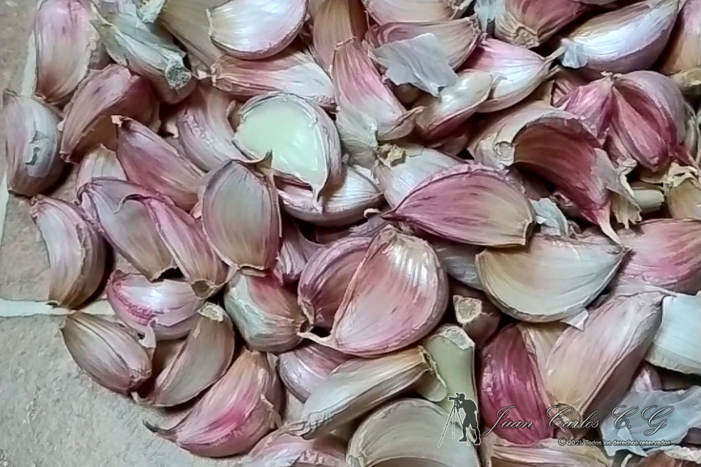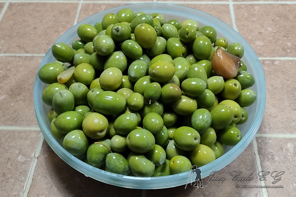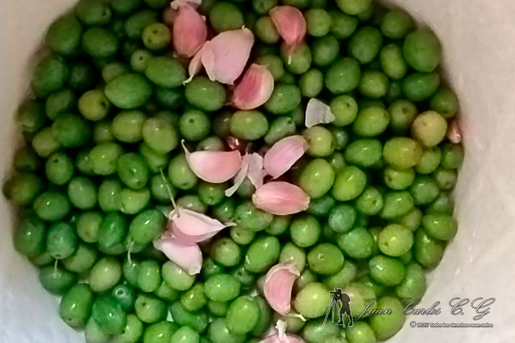 2- Se añaden los dientes de ajo enteros y con la piel y se dejan durante unos meses. La proporción de ajo es como en las rajadas, una cabeza por cada kilo y medio o dos kilos de aceitunas. Estas aceitunas se preparan en otoño y se consumen a partir de la primavera, y como su nombre indica, duran todo el año.